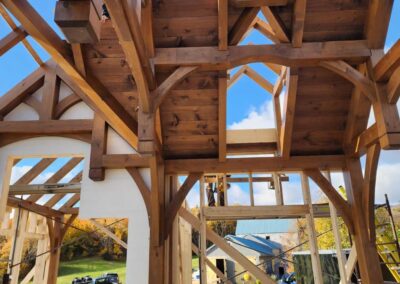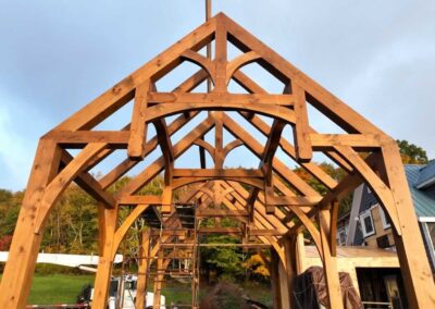 This new timber frame is connected to an existing, renovated house with a breezeway.